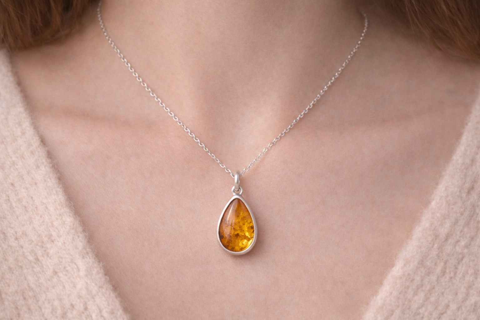 Each piece of amber is unique — some contain tiny natural inclusions that have been preserved for millions of years, making every pendant a small window into deep time. The silver setting has a softly brushed finish that complements the amber's warm honey tones.